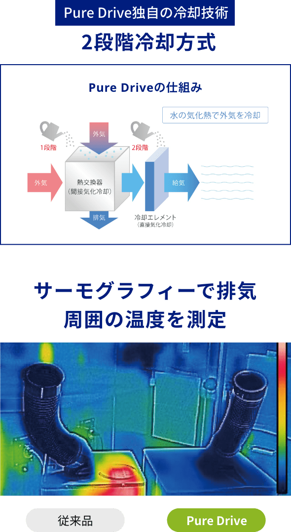 液体が気体に変化する際に周囲から熱をうばう「気化現象」を利用した冷却方式を採用。間接気化冷却と直接気化冷却の2段階で冷却を行うことで、排熱を出さずに、冷風を送り出す新システムを実現しました。取り込んだ外気を、水の気化熱を利用して2段階で冷却。排熱を出さずに冷風だけを届けます。排熱による周囲への影響がないため、作業環境の快適性がUP。排熱を逃すためのダクトも必要ありません。従来品と比べても、Pure Driveは、排気、周囲の温度が上昇していないことがわかります。