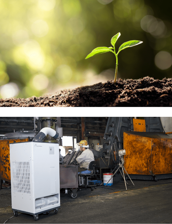 地球環境への負荷低減に貢献するフロン不使用のスポットクーラー。フロン排出抑制法※で定められた日常点検や冷媒廃棄にかかる費用が不要。コスト面でも大きなメリットを提供します。